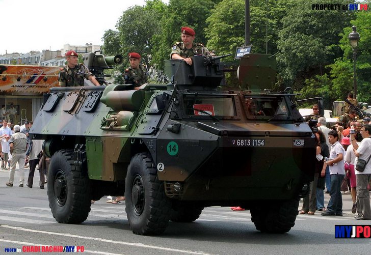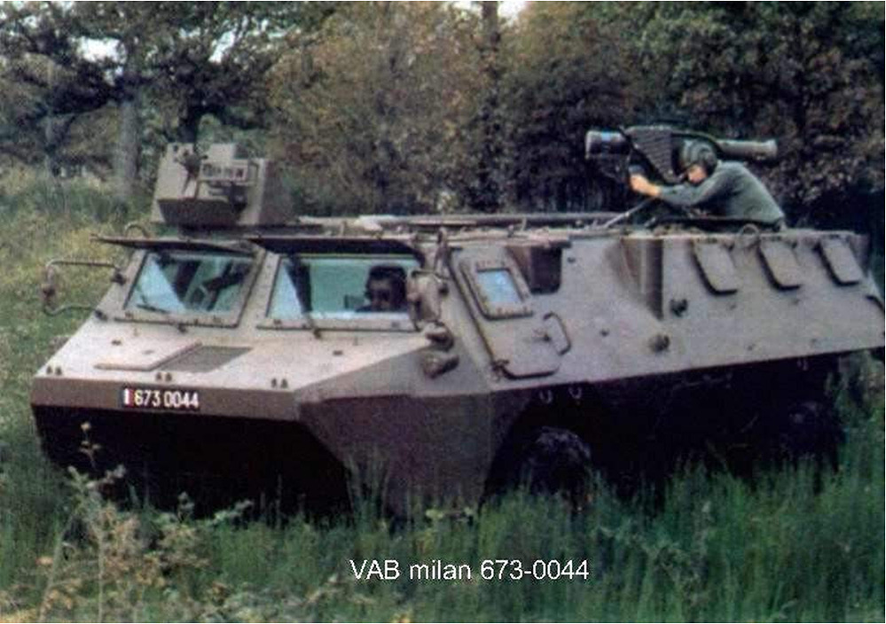 VAB MILAN : version aménagée pour transporter deux postes de tir et douze missiles antichars MILAN. Il possède un tourelleau CB52 armé d'une mitrailleuse ANF1 de calibre 7,62 mm.