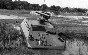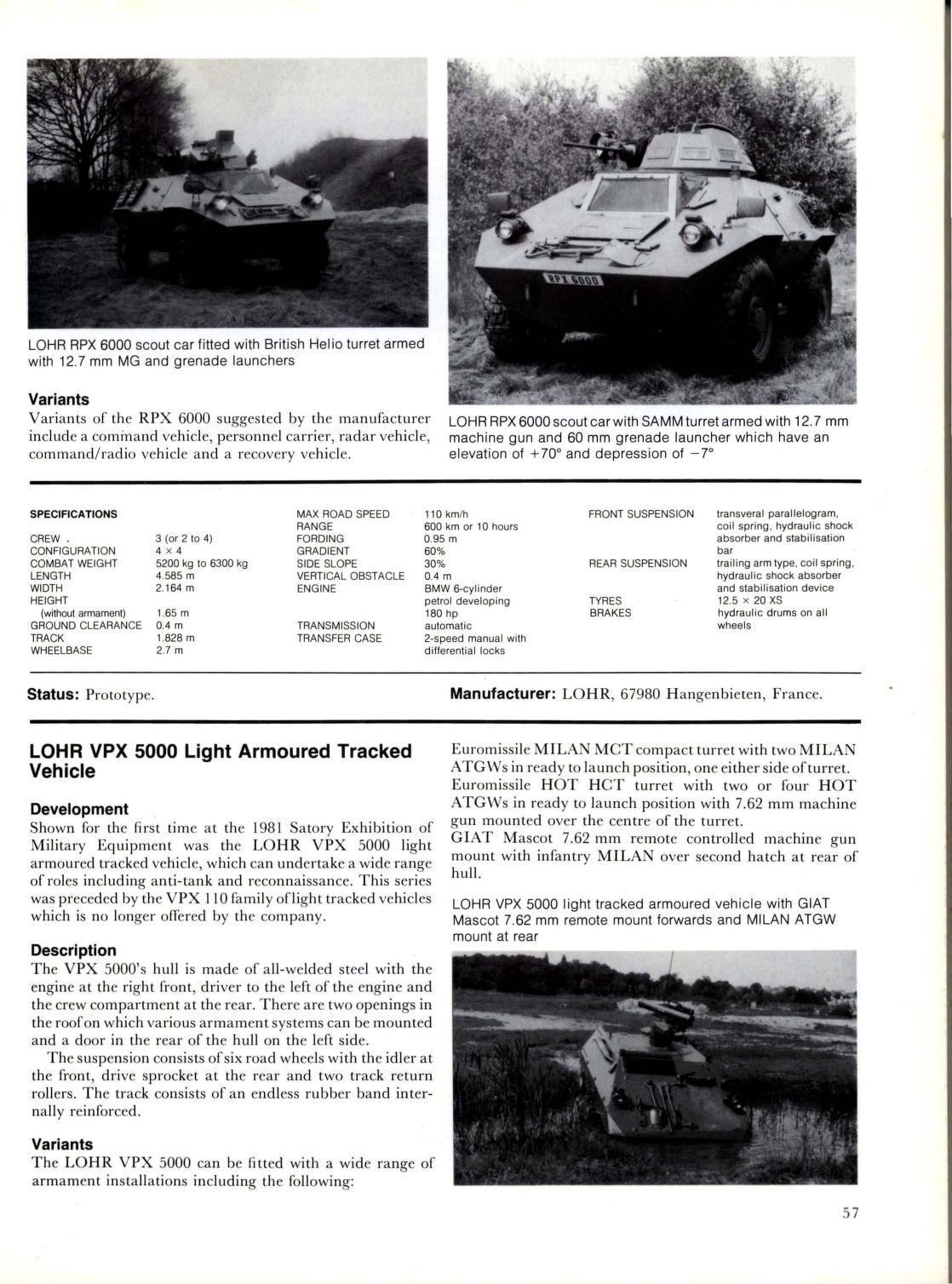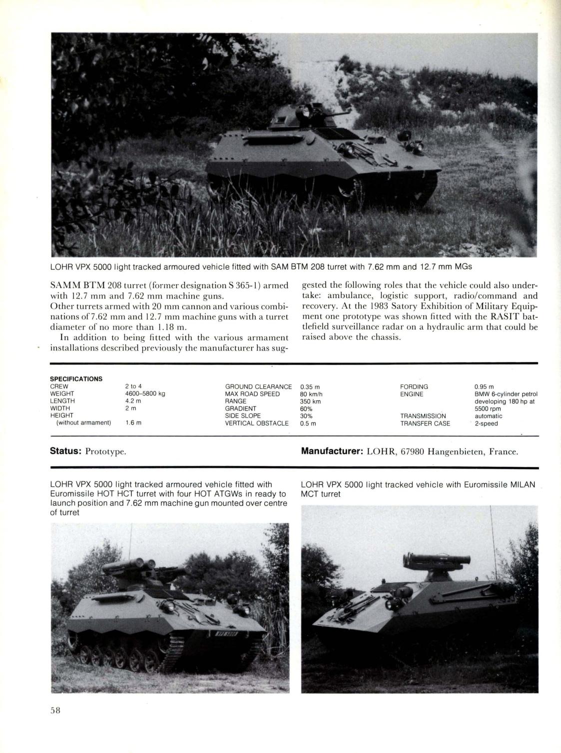 le VPX 5000 était développé par LOHR à la fin des années 70. révélé pour la première fois en 1981, 10 véhicules ont été construits jusqu'en 1989 à des fins d'essai et d'essai et de commercialisation. le réservoir était un réservoir extrêmement petit et léger qui pouvait transporter un grand choix d'armement léger. Lohr offrant un grand choix de bons véhicules au début des années 80 visait les marchés internationaux et a essayé de se faire un nom. principalement en offrant des véhicules légers, ils ont mis leur espoir sur la légèreté de leurs véhicules et leur grande mobilité pour gagner quelques contrats. le VPX 5000 était une famille des réservoirs qui offraient une grande mobilité pour un véhicule compact. proche du concept du Wiesel allemand, ce réservoir peut porter différentes armes et faire différentes missions. la version que nous suggérons ici est