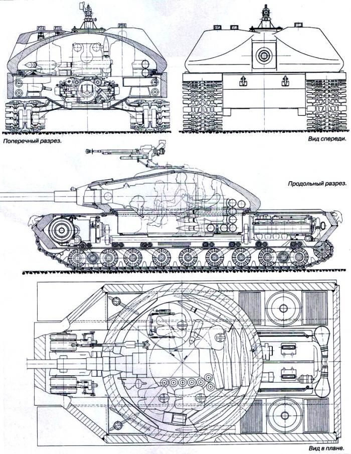 Dans la premiere version, le char avait un agencement avec le placement de tout l'équipage dans la tourelle. Comme arme principale, il était censé utiliser un canon D-46T de 100 mm.